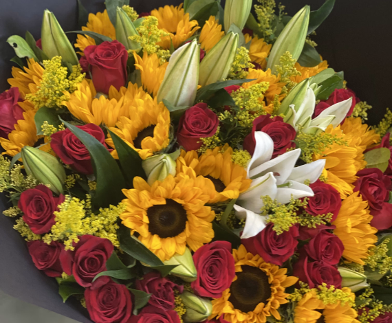 The Lily, Rose & Sunflower Bouquet is a vibrant and beautifully balanced arrangement that brings together elegance, romance, and joy in one stunning display. With a harmonious blend of soft and bold tones, it creates a lively yet graceful look that feels both eye-catching and refined. The contrast of delicate beauty and radiant warmth gives the bouquet a unique charm that stands out effortlessly.