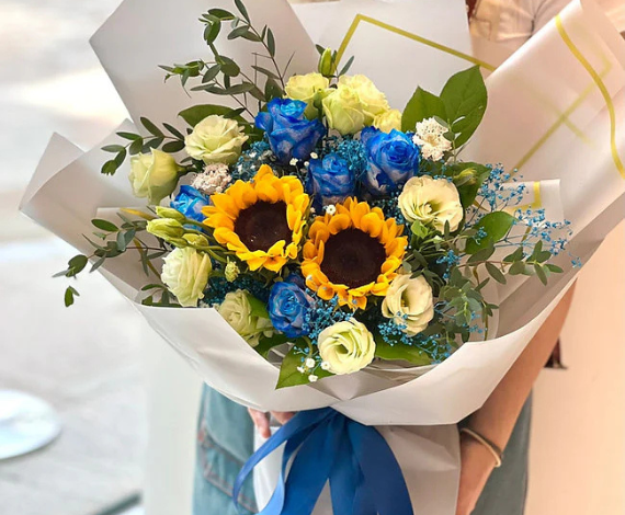 Carefully arranged to highlight the beauty of each bloom, this bouquet balances boldness with harmony, making it perfect for those who want to give a gift that stands out. Wrapped with a modern, elegant finish, the Mix Sunflower and Blue Roses bouquet is ideal for celebrating special moments with creativity, charm, and unforgettable style. 🌻💙🌹